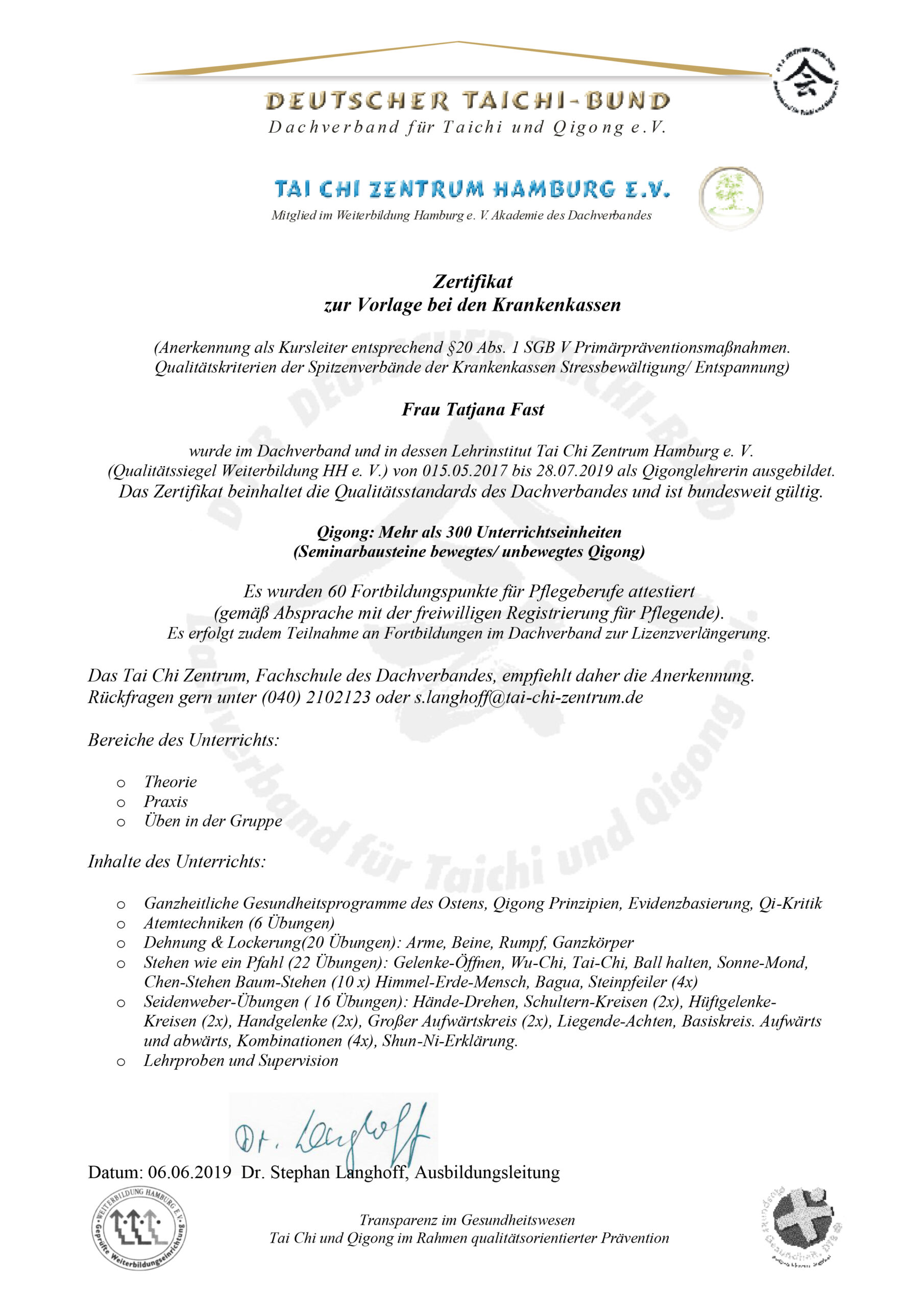 Der Höhepunkt kam dann 2009 nach einem Sturz mit Inline Skatern. Ich hatte mir zwar nichts gebrochen, aber ich hatte unerträgliche Schmerzen durch einen verschobenen Wirbel im Rücken. Die gängigen Ärzte versuchten es mit Einrenken und verschrieben mir Schmerzmittel. Ich habe jahrelang Diclofenac genommen, doch geholfen hatte es nicht. Der erste richtige Schritt zu meiner inneren Heilung war dann eine DVD, die Qigong und Tai Chi Übungen enthielt. Ich erkannte schnell, dass die Kombination aus Atem, – Bewegungs – und Meditationsübungen meine Schmerzen linderten und sich für mich neue Erkenntnisse zu Energiearbeit ergaben. So hatte ich zwar schon das Wissen und den Glauben über die Lehre vom Bioenergiefeld erworben, aber Qi Gong und Tai Chi ließen mich weiter erwachen. Ich wollte das Leben und den Körper im Ganzen verstehen. Ich machte eine Ausbildung als Qigong und Tai Chi Lehrerin und eignete mir auch das fundierte Wissen über Kinesiologie und Body Talk an. Inzwischen bin ich schmerzfrei und stehe fest in meiner Mitte. Dieses Gefühl von Gesundheit, Entspanntheit, Zufriedenheit und Beweglichkeit möchte ich auch gerne anderen Menschen in meinem Studio geben.